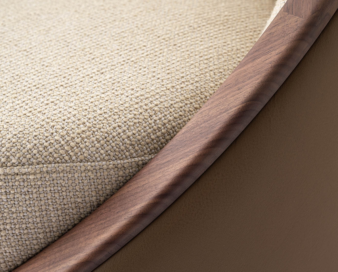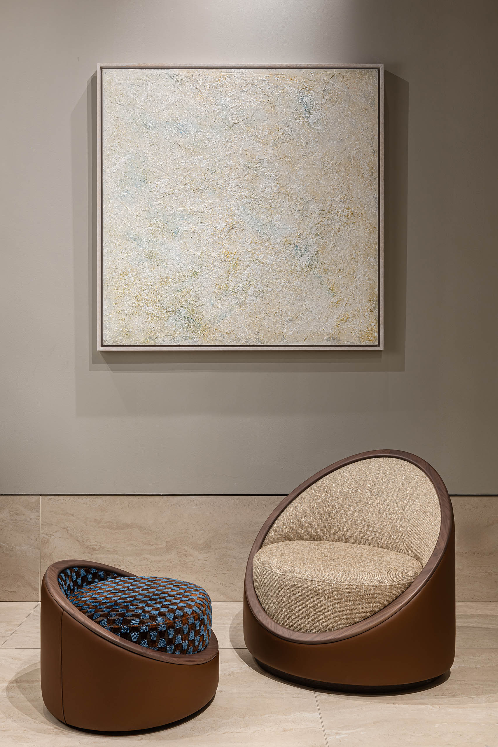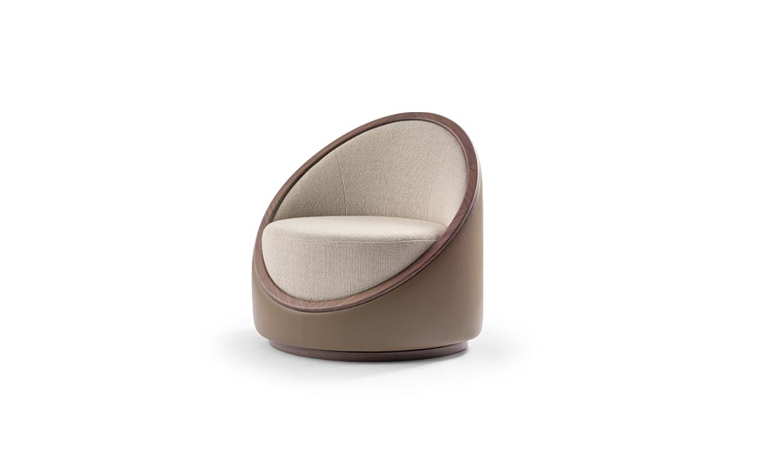 Der Sessel Artis Wood verfügt über eine runde Sitzfläche, eine halbmondförmige Rückenlehne und einen zylindrischen Sockel. Der Drehmechanismus erhöht seine Vielseitigkeit und ermöglicht einen fließenden Übergang zwischen Gespräch und Entspannung. Das ringförmige Detail aus Nussbaum wurde entworfen, um den Materialkontrast zu betonen und den Sitzkomfort hervorzuheben.