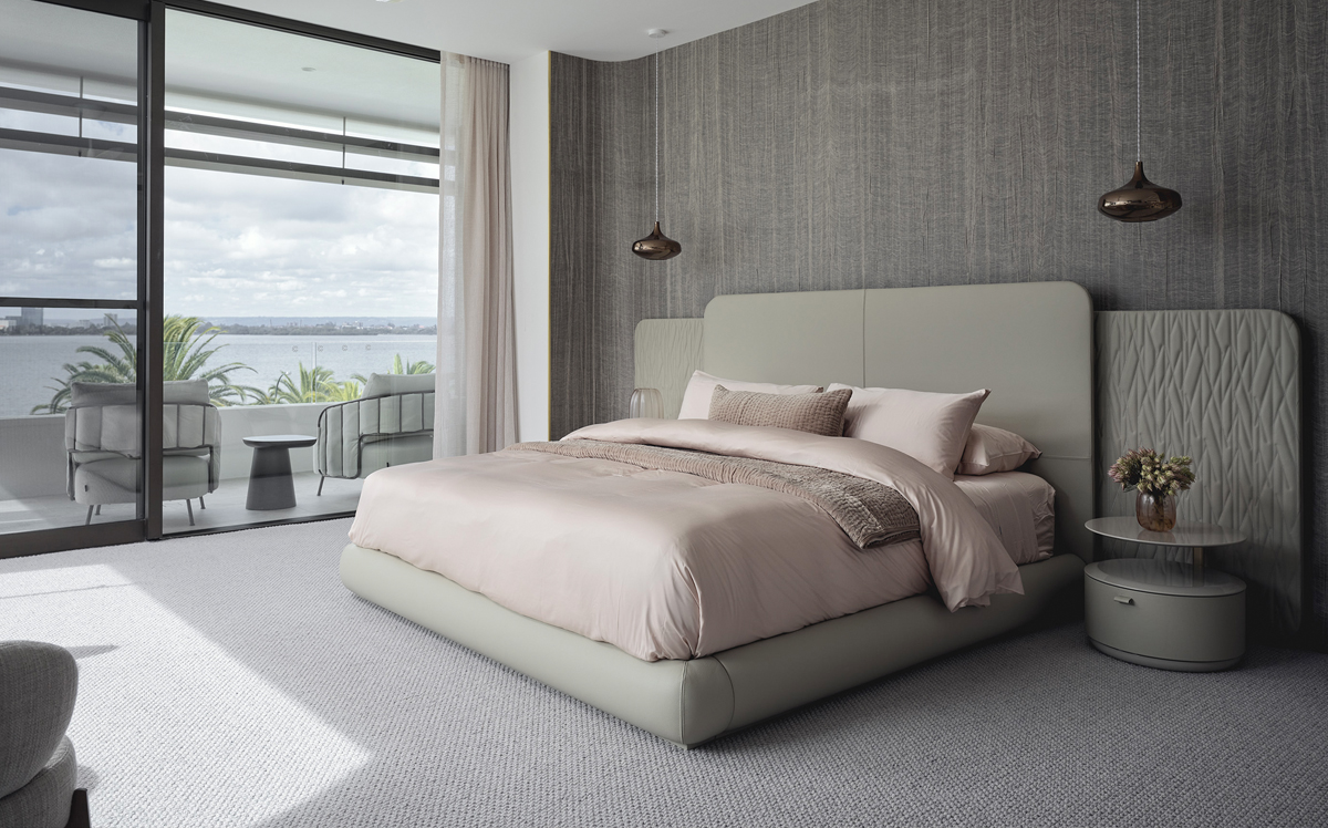Die Roma-Kollektion, entworfen von Monica Armani für Turri, ist der unbestrittene Protagonist des Schlafbereichs. Im Zentrum des Raumes vermittelt das Roma-Bett mit seinem vollständig lederbezogenen Flügelrahmen ein Gefühl von umhüllendem Komfort und raffinierter Schlichtheit.