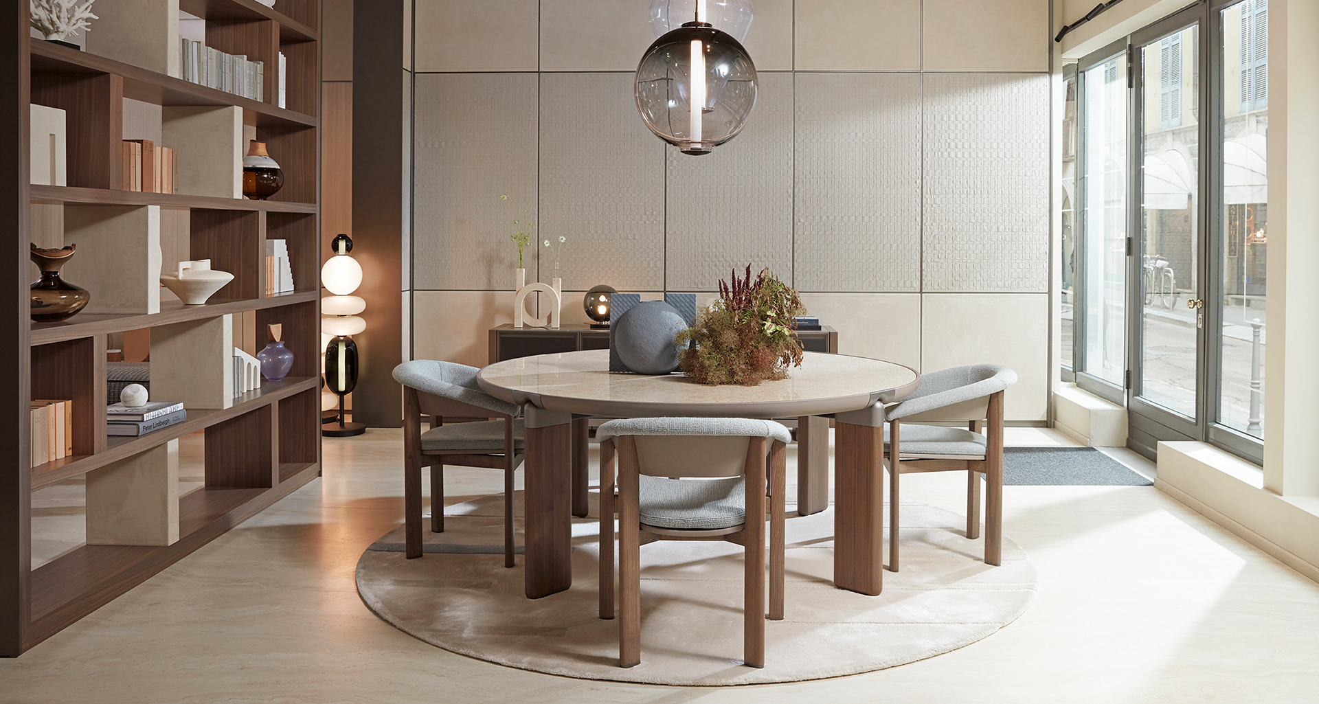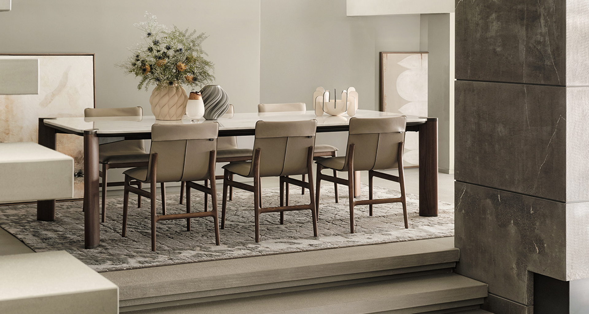 a la mesa sillas, vitrinas, aparadores y muebles de bar que saben dar sabor a saber vivir gracias a las hábiles combinaciones de mármol, madera, cuero y metal.