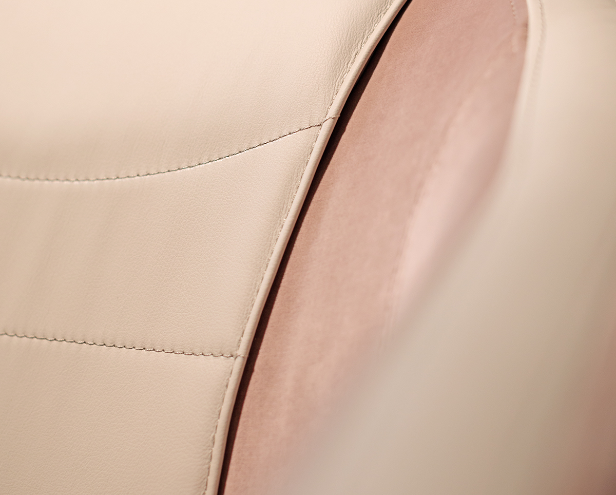Le petit fauteuil de la collection Bloom a des lignes souples et élégantes. Son profil sinueux lui confère une sensation de confort et d’équilibre Les fauteuils sont disponibles en deux versions, avec appuie-tête en cuir ou avec sangle latérale, et revêtement en cuir ou en tissu.
