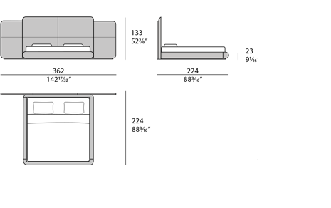 Dans la chambre à coucher de la collection Roma, le lit joue un rôle fondamental: il est constitué d’une structure en aile, entièrement recouverte de tissu ou de cuir, tant pour la tête de lit que pour le cadre de lit.