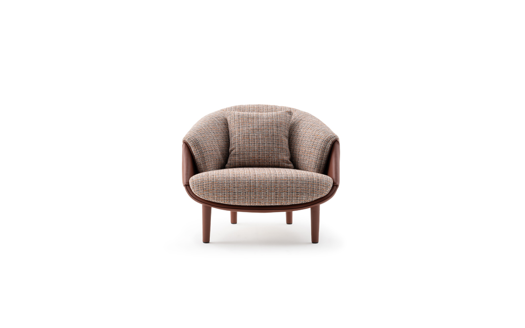 La ricerca del contemporaneo della poltrona Riban si rivela in un gioco di superfici e torsioni in cui l’esterno diventa interno, in cui lo schienale diventa seduta, e i materiali si alternano in modo tanto organico quanto logico.