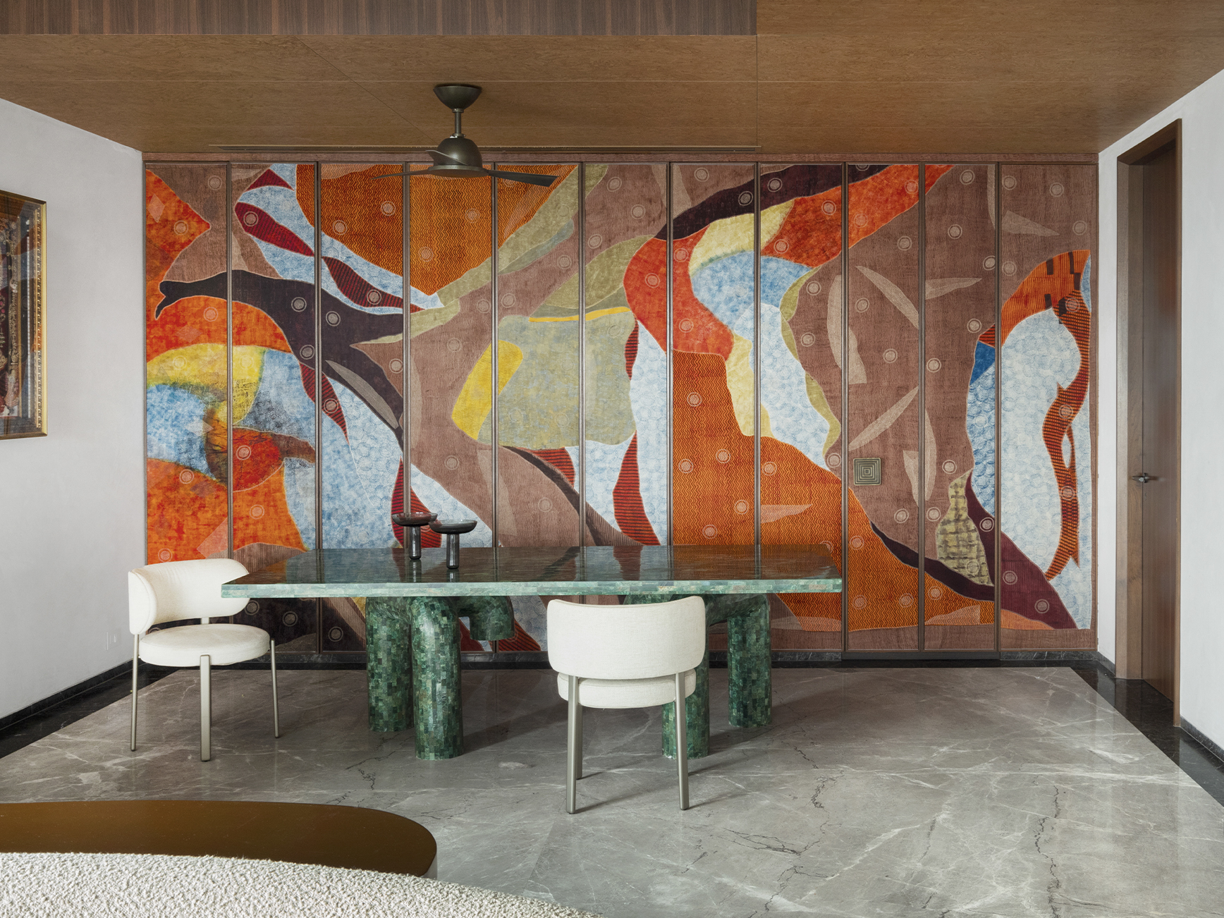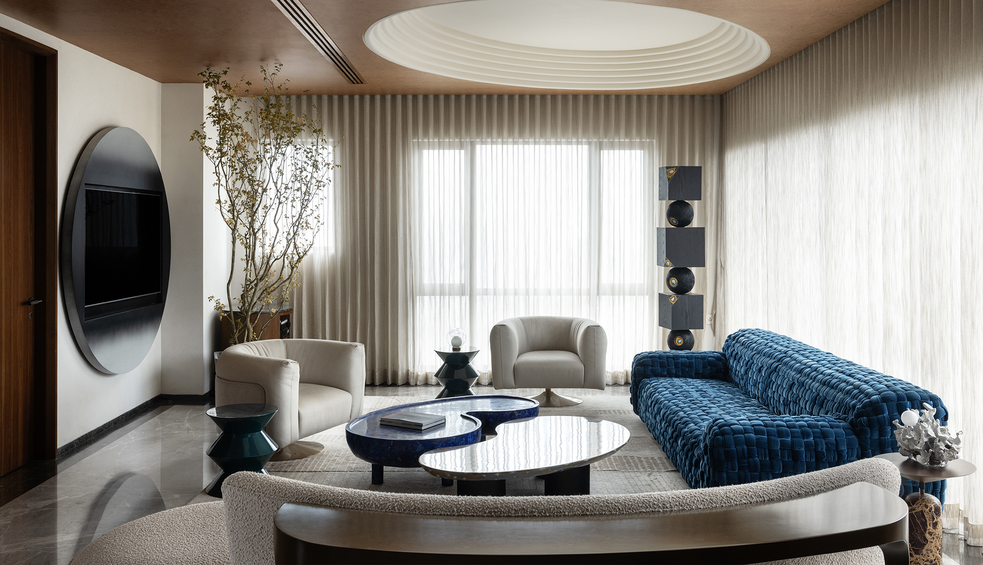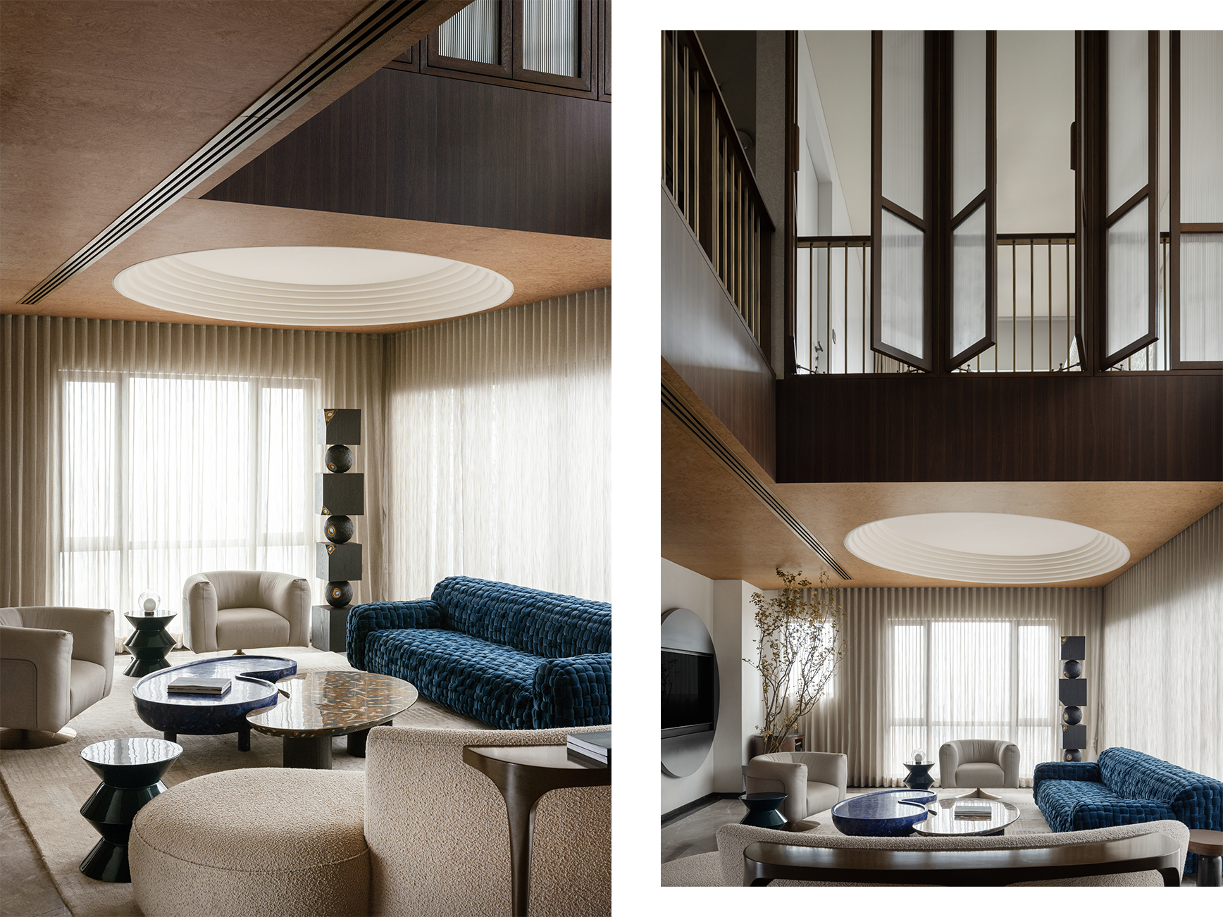 At the centre of the apartment, a large double-height void opens up, like a vertical cut that ideally connects the two floors. Natural light streams through the wide windows at varying intensities throughout the day, highlighting the living area. Here, the intense and refined lapis-lazuli blue velvet of the Azul sofa, designed by Paola Navone for Turri and meticulously hand-tied, intersects with the Soul armchairs by Giuseppe Viganò and the Roma chairs by Monica Armani in their lighter tones. Carefully selected for both communal and private areas, Turri furnishings convey the concept of home as a space of sharing, rootedness, and continuity, accompanying the different moments of domestic life: from the spacious and luminous living rooms, defined by generously proportioned sofas with bespoke finishes, to more intimate spaces where tables, seating, and storage pieces create an elegant yet welcoming domestic landscape.